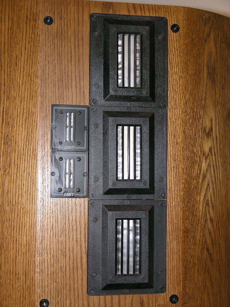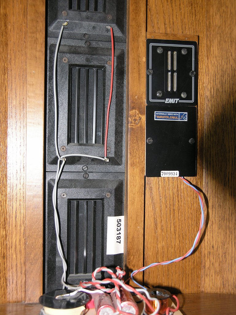 Für den Superhochtöner "S-Emit" (mit auf dem Bild oben links, unterer Teil) wurden vergleichbare Bauteile verwendet, wie beim Rear-Emit. Der Grund hierfür liegt im Frequenzbereich begründet, der hier vorliegt. Da der S-Emit erst ab 10000 Hz arbeitet, dürfte es wohl kaum noch möglich sein, noch feinere Details zu hören, da das menschliche Gehör oberhalb dieser Frequenz kaum noch unterschiede wahrnehmen kann. Daher würden hier auch höherwertigere Bauteile keinen Sinn mehr machen. Sie würden nur mehr kosten, ohne dabei aber den Nutzen zu bringen.
