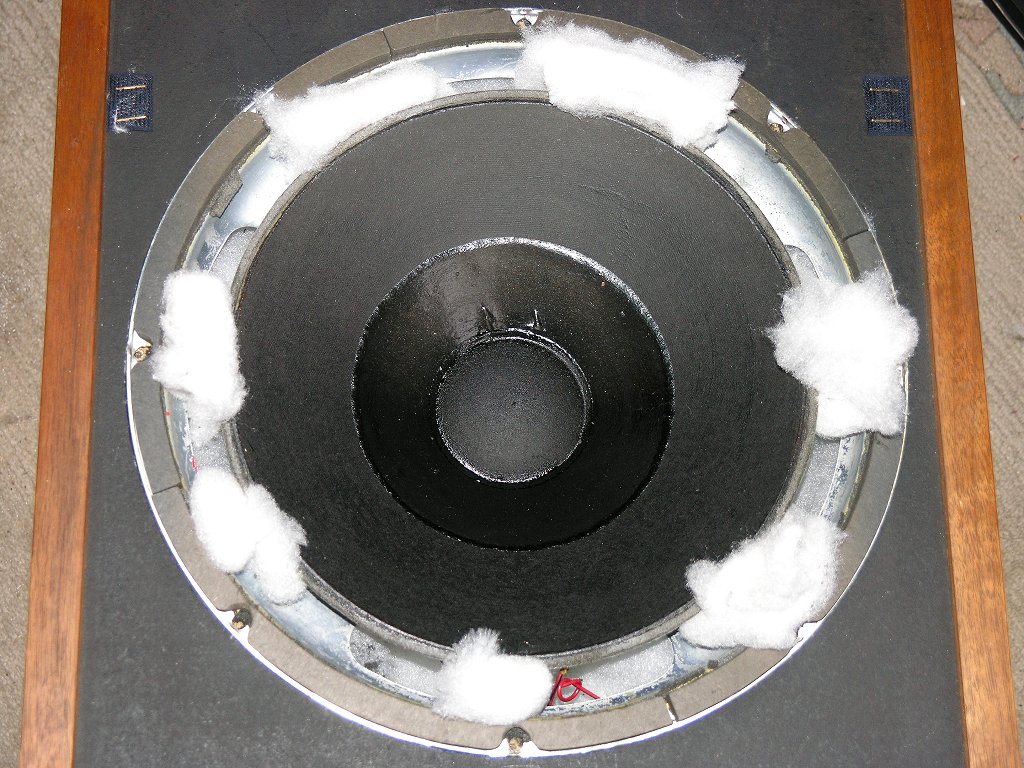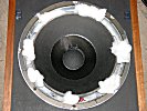 Damit die Membran während dem Transport selbst keinen Schaden durch die eigenen Bewegungen bekommt, weil auf dem Hinweg meistens die Sicken schon teilweise oder völlig fehlen, gibt es hier ein Paradebeispiel für die Sicherung der Membran selbst. Da die Sicken rund um die Membran nicht mehr die notwendige Führung bieten können, müssen diese für den sicheren Transport durch eine Polsterung ersetzt werden. Das geschieht am einfachsten mit Resten von Fliess aus Polyester, Teilen der boxeneigenen Dämmwolle, weichen Schaumgummistücken, ausreichend großen Wattebällchen oder Ähnlichem. Diese Reste werden z.B. zu kleinen Rollen oder Knäueln zusammen gedreht, die etwa doppelt so groß im Durchmesser sind, wie der offene Spalt zwischen der Membran und dem äußeren Korbrand. In den meisten Fällen wird das bei ca. 4-5 cm Durchmesser hinkommen.