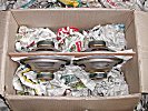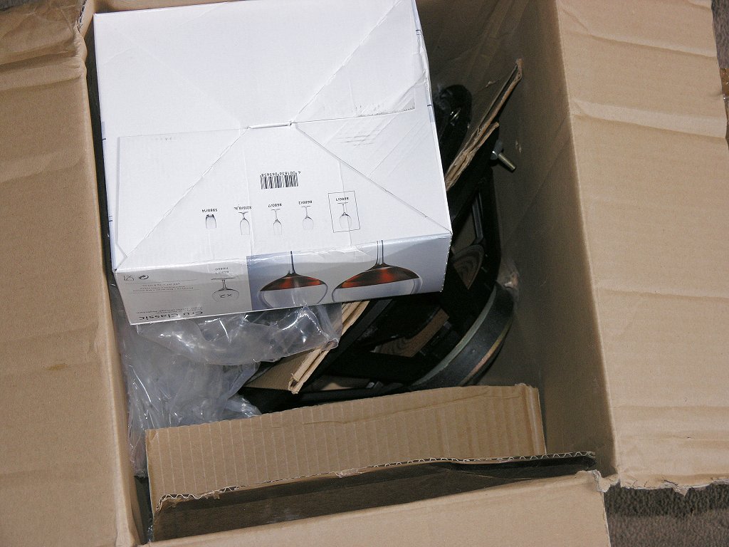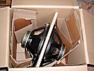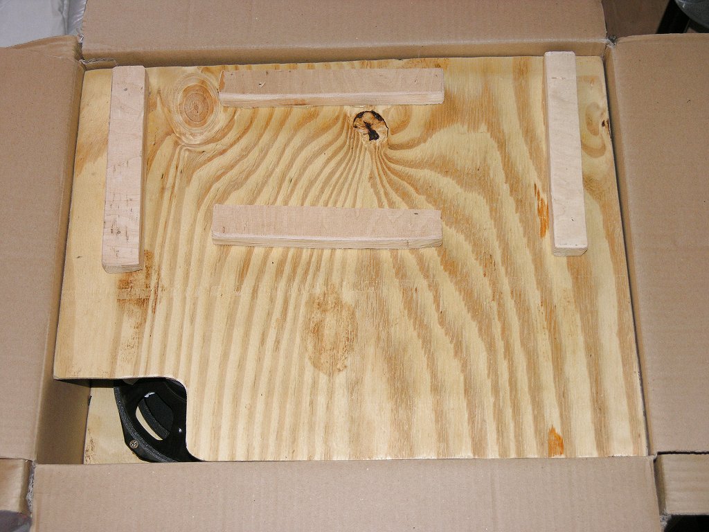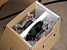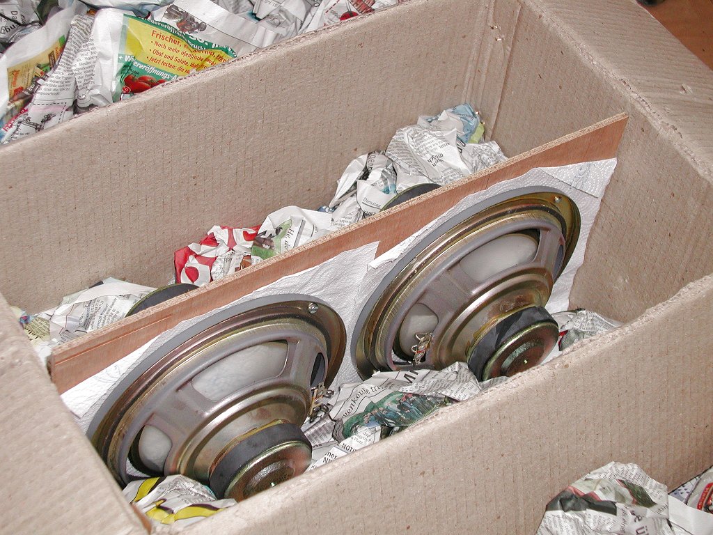 Das Ganze wird dann ganz oder teilweise diagonal in einen stabilen Karton gesetzt und noch zusätzlich mit geeigneten Materialien (Kartonreste, Styropor - aber keine Styroporflocken! etc) fixiert und geführt. Natürlich sollte die "Polsterung" ausreichend fest sitzen. In den Bildern ist das nur mal angedeutet. Es sollte schon besser etwas mehr Füllmaterial in den Karton, so dass das eigentliche Brett mit den Bässen auch ganz sicher nicht mehr umkippen kann.