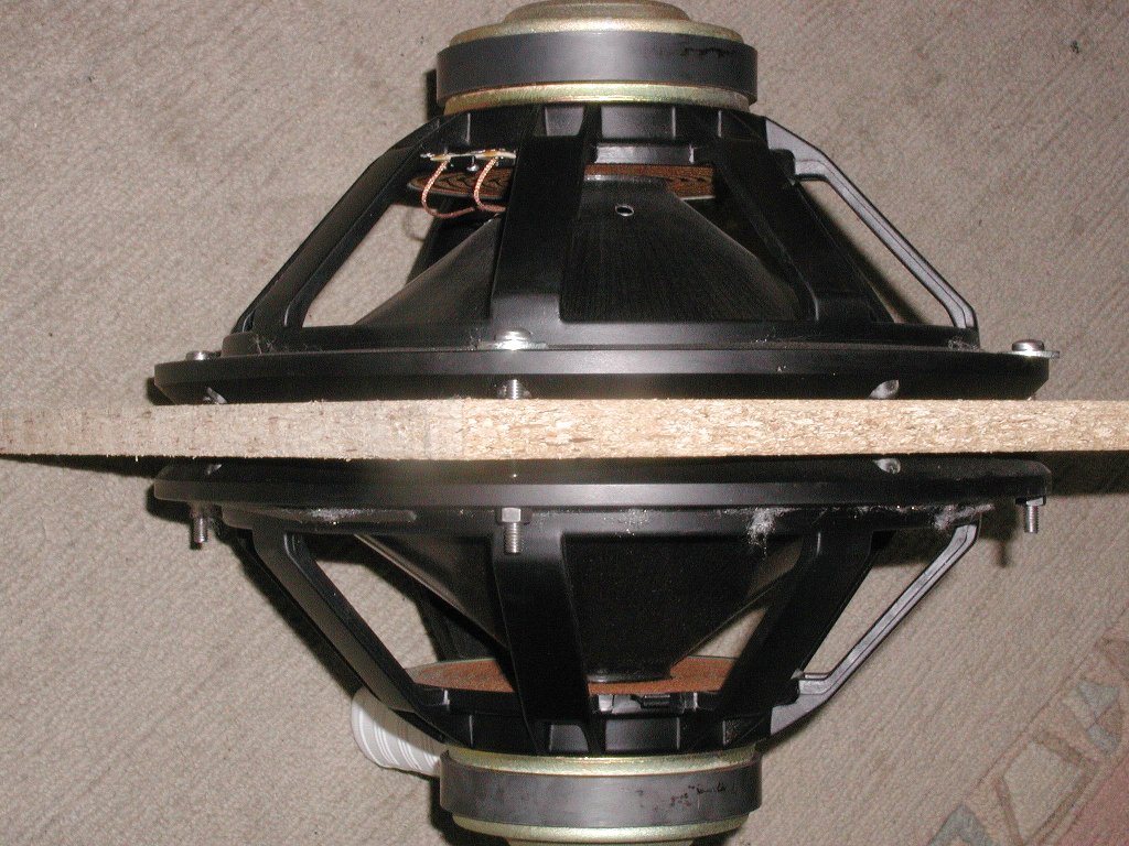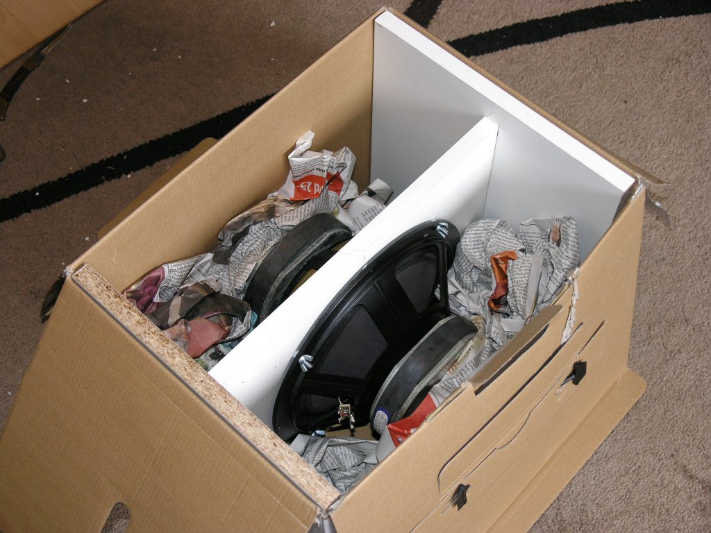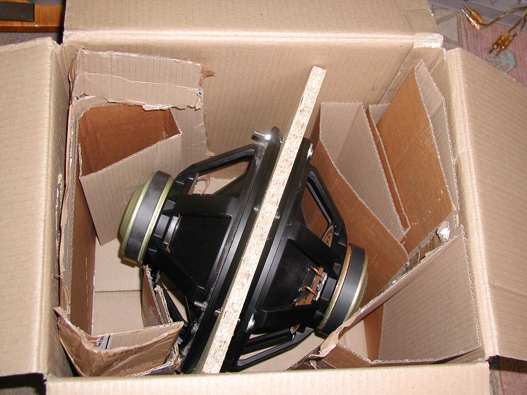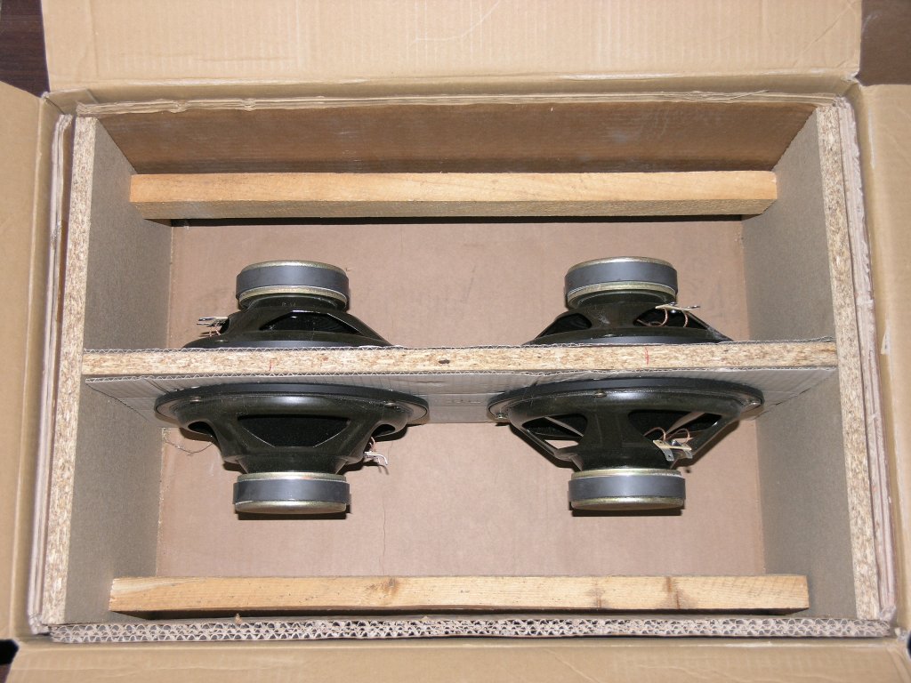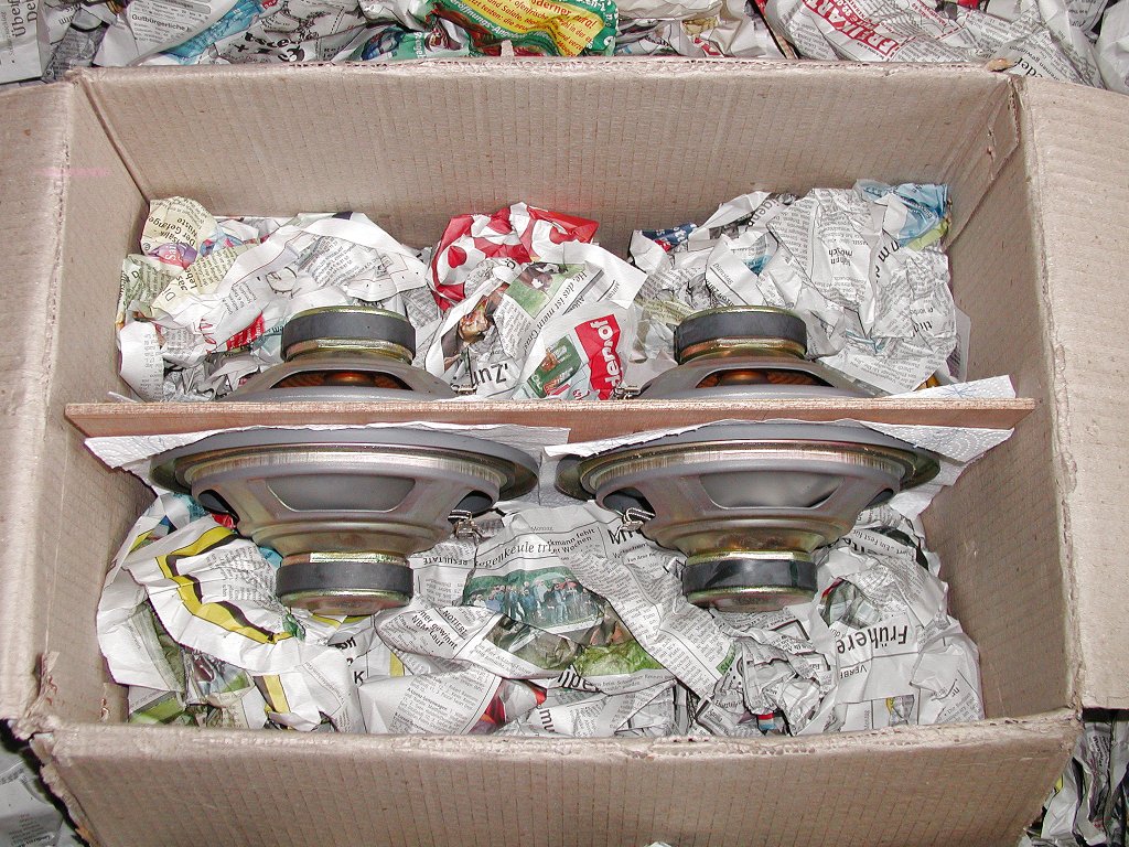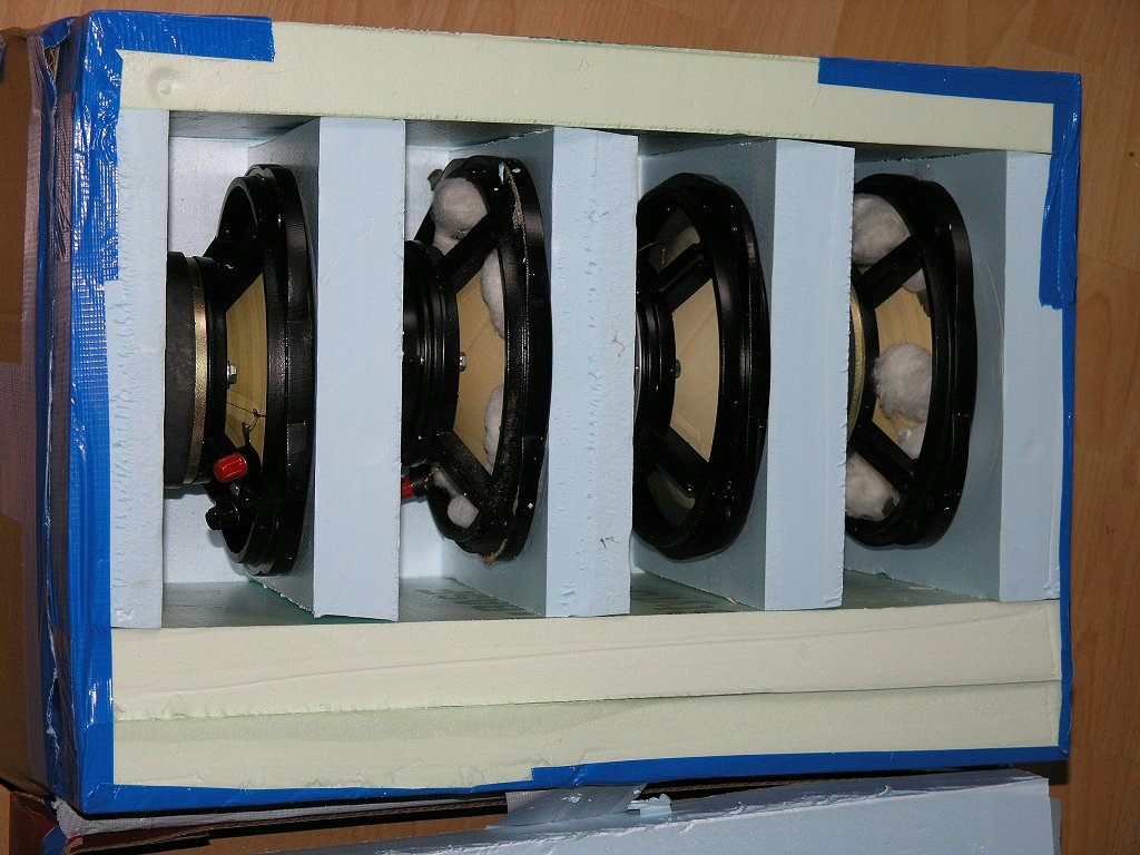 Eine optimale Verpackung für den Versand ist der beste und sicherste Weg für eine unversehrte Ankunft beim Empfänger. Die sicherste Verpackung ist eigentlich ganz simpel. Die Chassis werden mit den Membranen gegeneinander mittels vier passenden, aber stabilen und ausreichend langen Schrauben (M5(6) x 60) und passenden Muttern zusammen verschraubt. Bitte hier KEINE Holz- oder Spaxschrauben verwenden! Diese haben oft die Eigenschaft, dass diese wegen unsachgemäßen Umgang durch die Transporter gerne ausreißen. Das passiert, weil die Magnete der Lautsprecher ein beträchtliches Gewicht haben, dass dann bei sehr starken Stößen oder Erschütterungen an den verhältnismäßig kleinen Schrauben übermäßig zerren. Schlechte Erfahrungen mit heraus gerissenen Spaxschrauben habe ich hier schon selbst gemacht. Das ist wirklich keine gute Idee mehr. Eine stabilisierende Platte aus Holz zwischen den beiden Bässen kann auch nicht schaden und hilft zugleich bei der besseren Verpackung (Siehe auch Bilder unten).